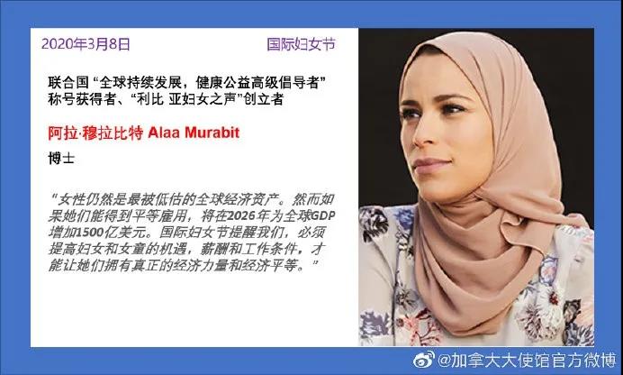 Alaa Murabit 1989年出生于萨斯喀彻温省,15岁到利比亚读医期间,她看到了一些传统文化和宗教禁忌对女性的限制与伤害。 于是她勇敢地发起了一场声势浩大的女权运动,不畏困难和威胁地捍卫女性的权利。 她因在妇女权利、全球卫生政策、教育、国际安全和可持续发展等问题上的领导能力而受到全世界的认可。