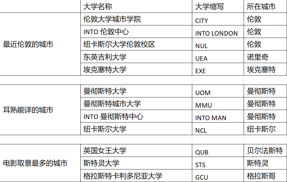 会计金融:斯特灵大学(未来的金融科技城)、埃克塞特大学、纽卡斯尔大学(包括本校和伦敦校区)、东英吉利大学、英国女王大学、曼彻斯特城市大学