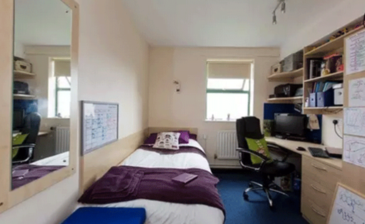 En-suite 房型是英国宿舍中最常见的一种房型。卧室内的基本配备与 Share 相似但自带独立卫浴,可以理解为单人独卫标准间。 En-suite 房型的马桶、洗手池和淋浴房通常是在一个空间内,另外极少有宿舍会提供浴缸。一般来说 En-suite 房型最为普遍,也最受学生欢迎。价格相对于 Share 房型稍高,但面积也稍大,大约在 13-15 平米左右。多了自己的独立卫浴,在生活中也方便了很多。有的宿舍公司会提供 Double En-suite Room 双人独卫房间,同样的设施,床的面积与房间的面积相对较大一些,约在 20 平米左右。