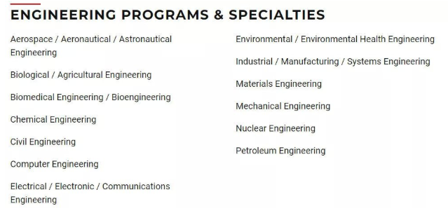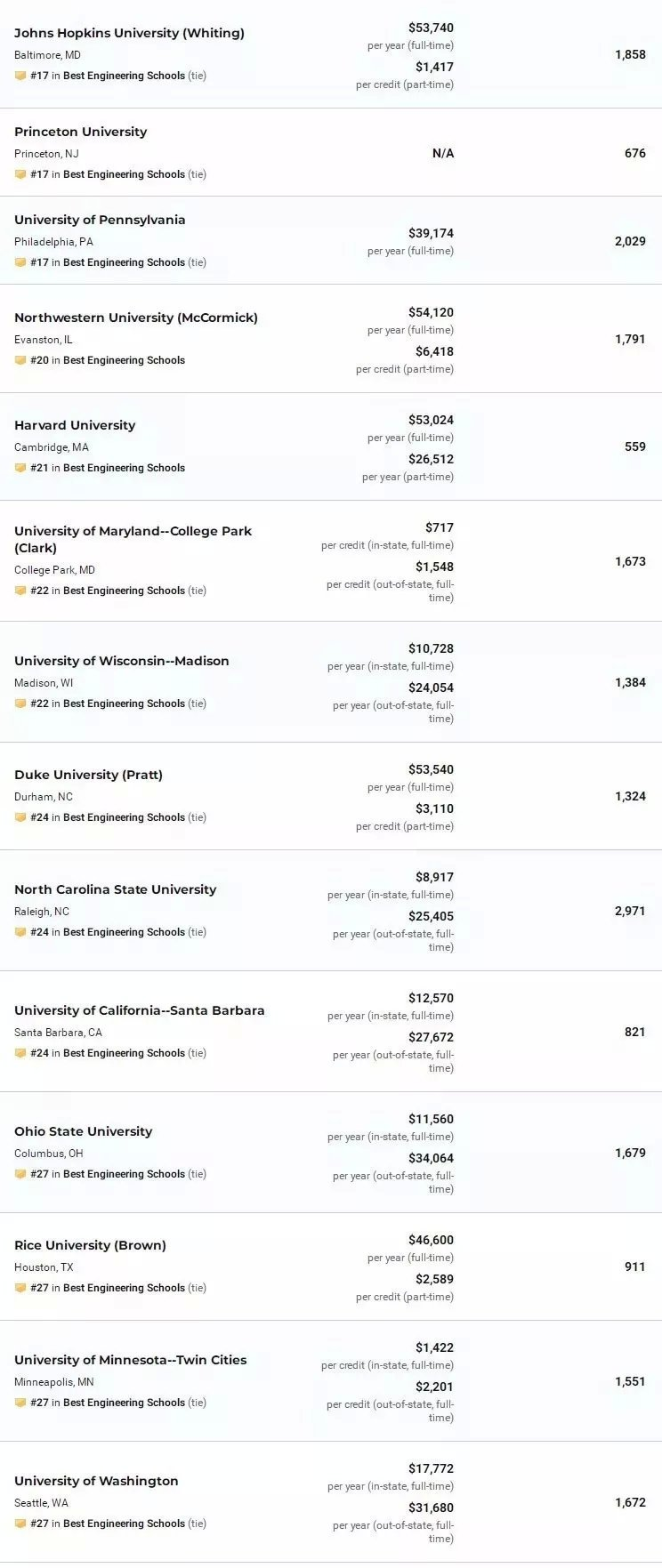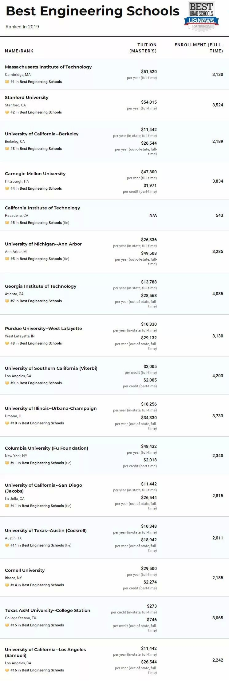 除了总的工程学院排名,USNews依然对2020年计算机工程、电子/电气/通信工程、航天航空工程、生物工程、生物医学工程、化学工程、土木工程、环境工程、工业工程、核工程、石油工程、机械工程、材料工程进行了具体排名。