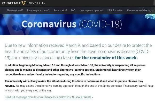 随着学生的春假开始, 美国大学和学校对学生和教职员工的潜在出差越来越感到恐慌,更多的大学宣布取消线下课程,全部改为线上授课 。一些机构已经发布旅行禁令,要求学生休息期间不得旅行,或者出国旅行的学生需自我隔离14天。