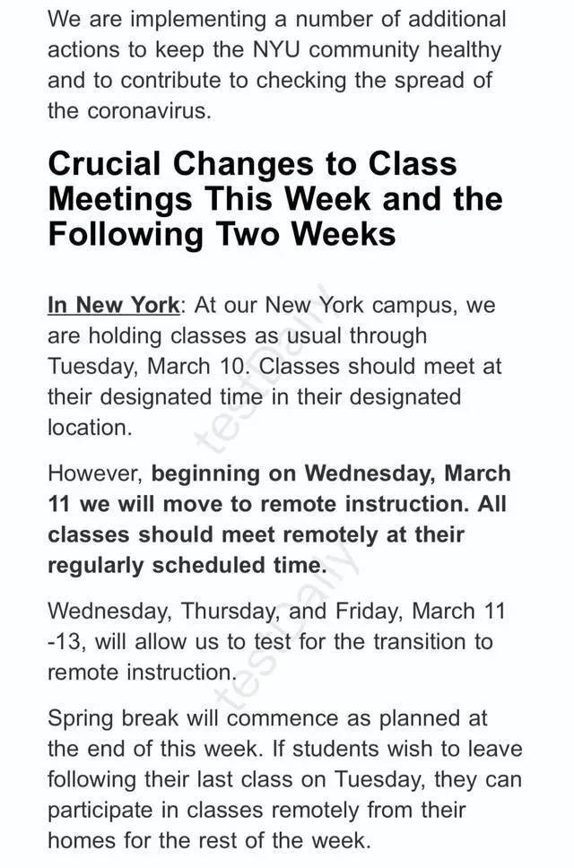 纽约大学也宣布了停课计划。 由于纽约大学分散在曼哈顿岛,而纽约州最近感染人数激增,为确保校内学生的安全,学校宣布3月11日后的课程会安排在线上进行。