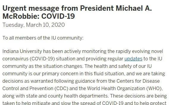 印第安纳大学通知学生4月6日前均采用线上授课。