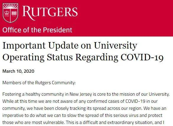 而提早开始春假的罗格斯大学要求学生4月3日前不要返校。