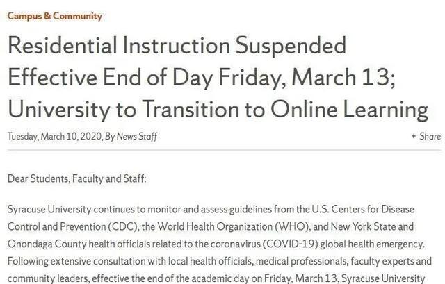 雪城大学要求学生本周撤离,线下课程恢复前不得返校。学校预计线下授课3月30日前不会恢复。