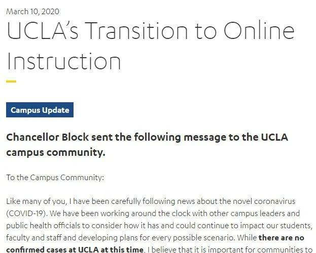 而采用 quarter学制的加州大学洛杉矶分校周二宣布,直到4月10日前,学校均采用线上授课。 学校建议学生远程学习,但学生如有需要依旧可以返回宿舍。