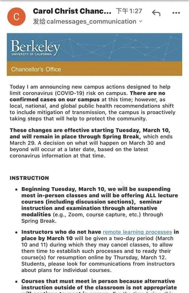 前几日伯克利市内有患者确认感染新型冠状病毒,很多学生和教职工提出停课的要求。当地时间今天下午一点半左右,伯克利的学生陆续收到了停课的通知, 学校称从3月10日起会停止校园内的现场授课,这一政策会持续到至少3月月底。期间的课程会通过zoom等软件完成。