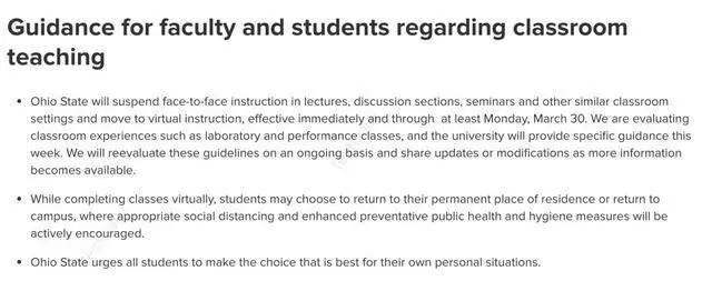 俄亥俄州立大学、普林斯顿大学:均停课至3月底。 两个学校决定接下来的课程也会通过在线的方式完成,俄亥俄州立大学的停课会持续到3月30日。