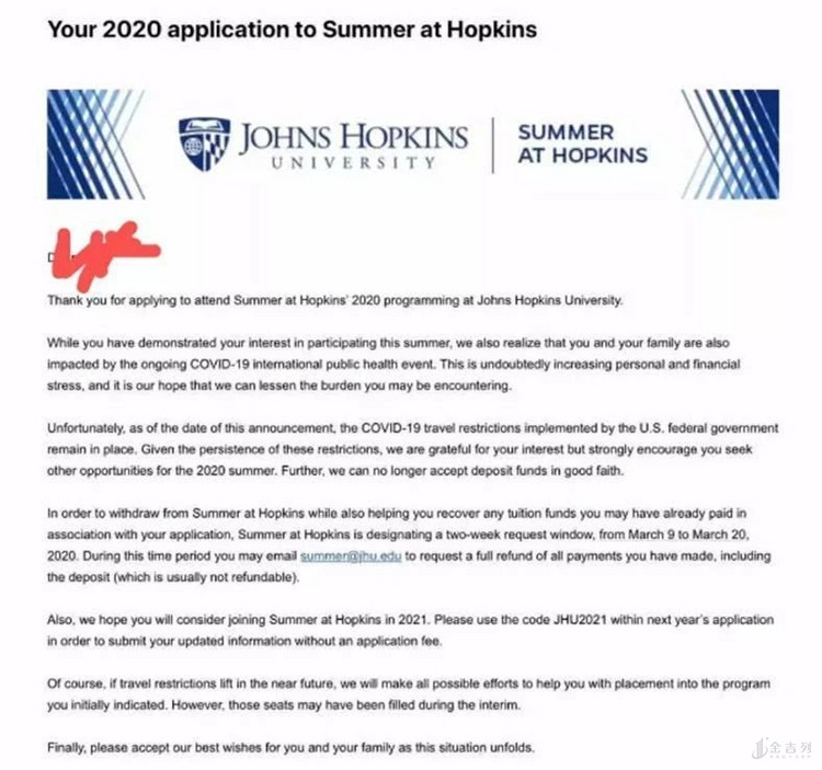 比如约翰霍普金斯大学给每一位中国申请夏校的学生发了封邮件: