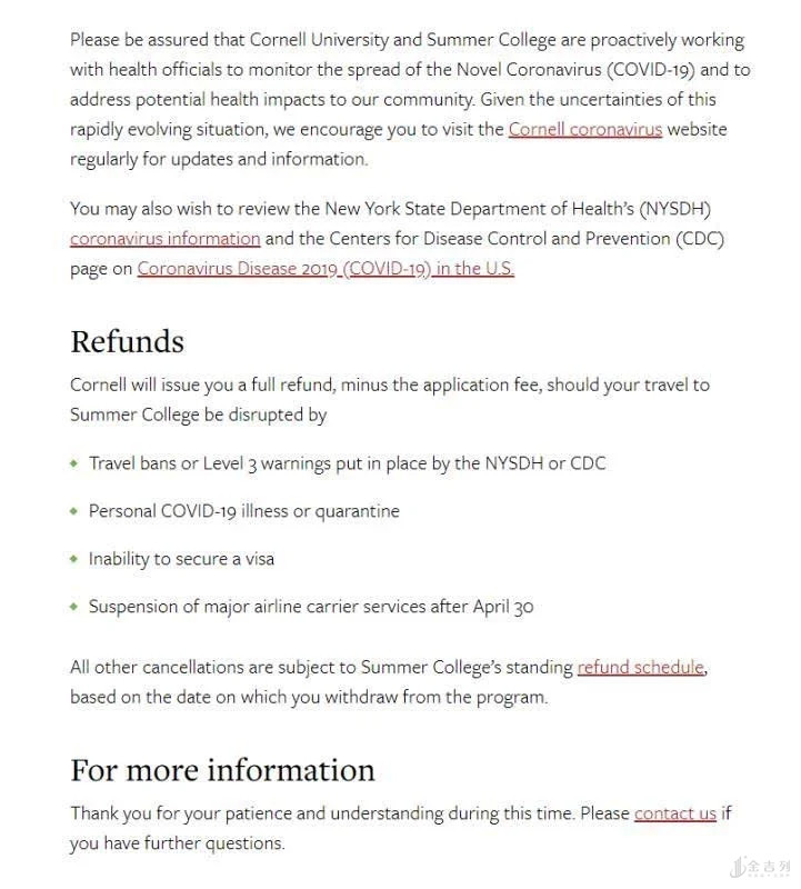 另外,我们可以看到康奈尔夏校行程的全额退费(不包括申请费)条件是:
