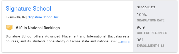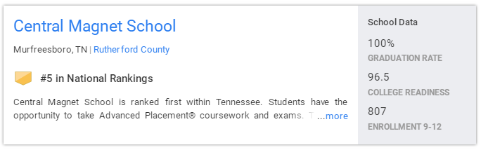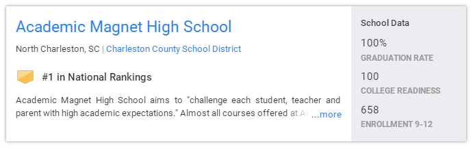 在全美范围的高中独立排名中,南卡罗莱州Acaemic Magnet High School排名第一。这所磁力高中(不以学区为限的高质量专精公立高中)提供的几乎所有课程,都是荣誉学分或AP课程;每个学生在毕业前都需要完成一个独立的研究项目,部分学生论文甚至登上了专业期刊杂志。