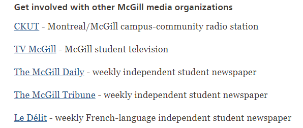 麦吉尔大学坐落于加拿大第二大城市蒙特利尔, 麦吉尔大学有着辉煌历史和非凡成就,其获得的诺贝尔奖与其他等国际性奖项均为加拿大最多。长期以来,在欧美声誉崇高,极受推崇和青睐。她的教学及研究水准被认可媲美美国八大常春藤盟校 ,其研究水平享誉世界,被称为“加拿大哈佛”。麦吉尔传媒学教学注重结合实际应用,迎合市场需求,其传播课程以 实践经验和实践学习为基础,并平衡了传播技巧和创造性思维两者之间的关系,使学生能够从中获取未来职业生涯的经验和信心。麦吉尔(McGill)学生提供了无数机会与当地的媒体机构互动的机会。 CKUT-蒙特利尔/麦吉尔校园社区广播电台、麦吉尔电视台 -麦吉尔学生电视台、麦吉尔日报 -每周独立学生报纸、麦吉尔论坛报 -每周独立学生报纸、LeDélit-每周法语独立学生报纸 。校园的活动包括发布定期的在线内容和举办活动,例如演讲活动,教育研讨会,电影放映等。