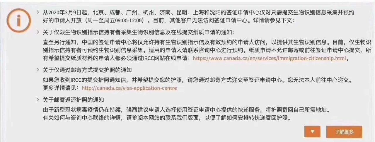 直至另行通知,中国的签证申请中心将仅允许持有生物识别指示信及有效预约的申请人访问,以提供其生物识别信息。目前,仅生物识别指示信持有者可预约生物识别信息采集。适用的申请人请联系咨询中心进行预约。纸质申请不允许邮寄或前往签证申请中心提交,所有希望提交纸质材料的申请人都必须通过IRCC网站在线申请。