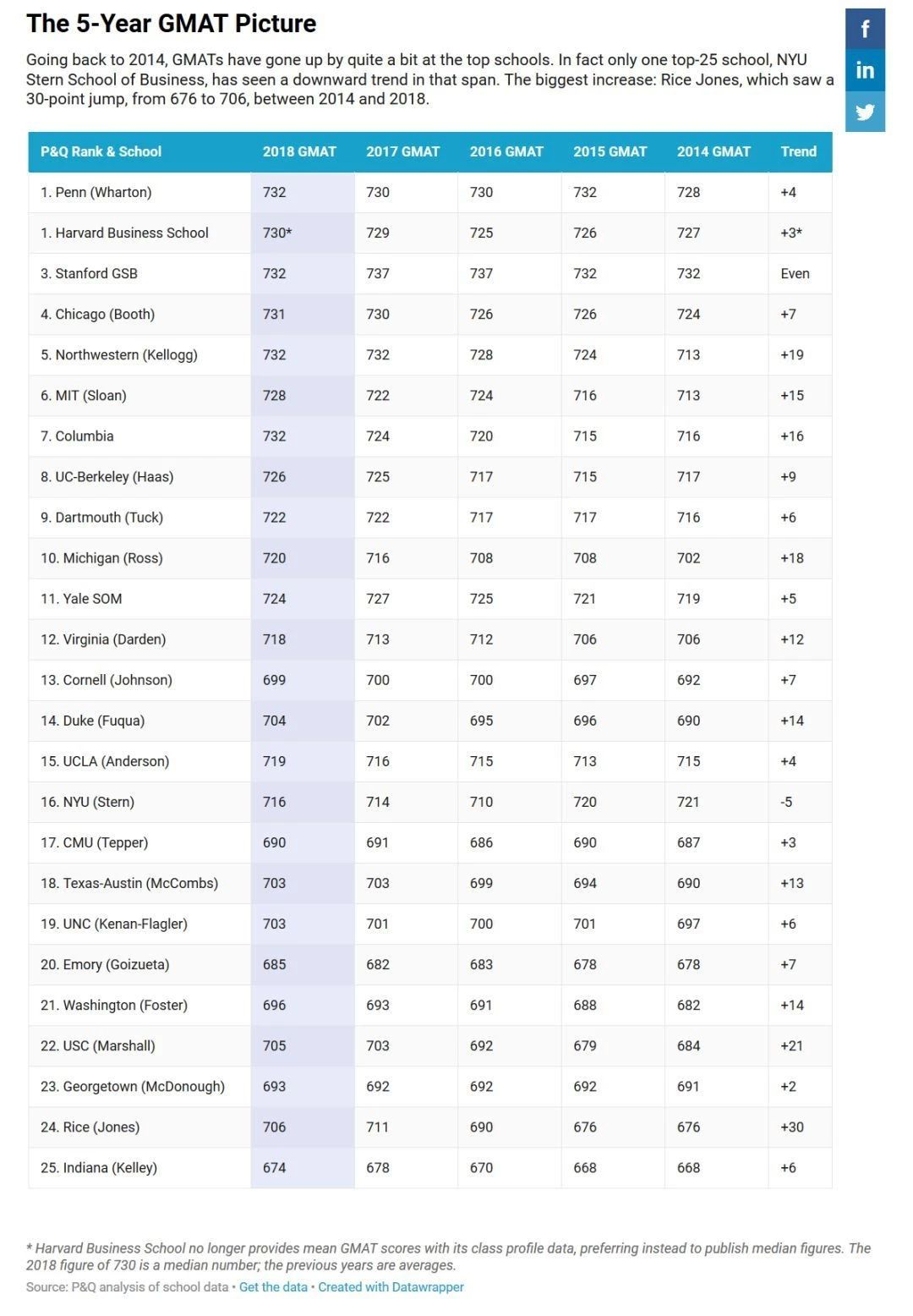 从最近的 2018 年数据上来看,前 25 名中有 6 所学校的 GMAT 成绩逐年下降, 15 所学校的 GMAT 成绩有所上升(平均上升 3.1 分), 3 所学校持平。前十名中涨幅最大的是哥伦比亚大学(从 724 分升至 732 分)和麻省理工学院斯隆商学院(从 722 分升至 728 分)。