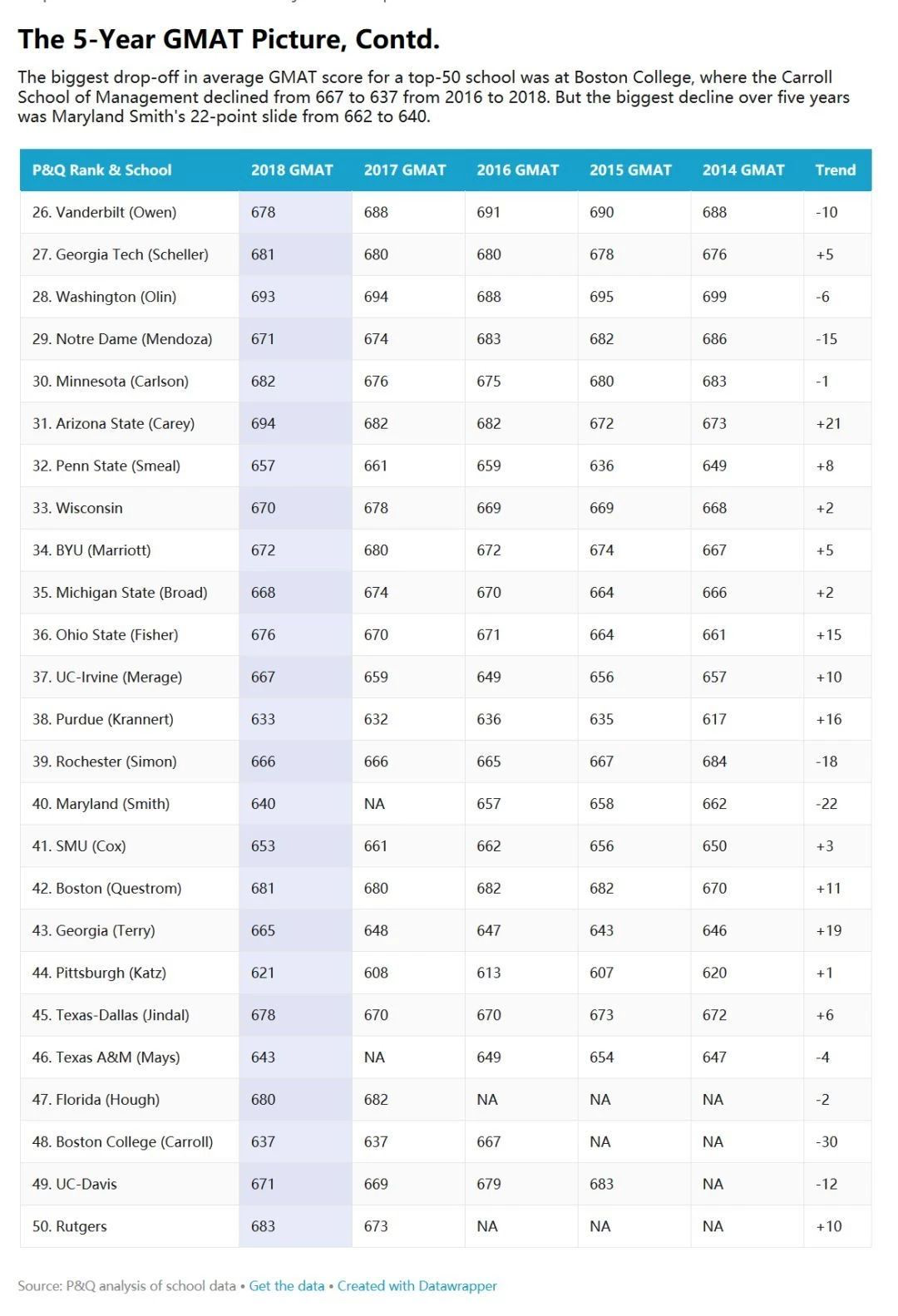 除了分数不断涨幅的学校之外,有 11 所学校在过去 5 年间出现了下降趋势。其中马里兰大学史密斯商学院的降幅最大,从 662 分降至 640 分。其他降幅的学校主要有罗切斯特大学西蒙商学院(从 684 分降至 666 分)、圣母大学商学院(从 686 分降至 671 分)以及范德堡大学欧文管理学院(从 688 分降至 678 分)。