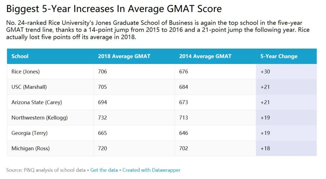 ▶ GMAT 成绩在 5 年内涨幅最大的商学院: