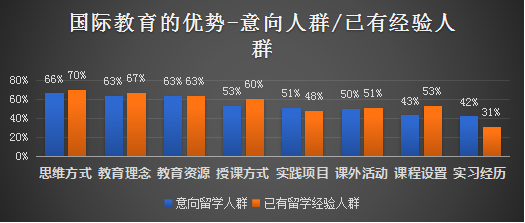 下图是意向国际教育或者已经在途的家长们最看重的国际教育的维度,给各位准备或还在犹豫国际化教育路线的家长一个参考,在此不逐一展开说,只想提醒各位家长,当代教育的使命变了,不再是把人类的存量精华知识传给下一代了。这一代人根本就不知道下一代人会用到什么样的知识,遇到什么样的挑战。尽可能激发每一个人的潜力,帮助孩子们找到自己的学习动机,也就是天分和兴趣所在,分头突围,各自应对各自的人生挑战才是。 家长们排在第一位的选择就是孩子独立思考的能力,即孩子判断和评估事实的能力(critical thinking)。 学生通过自己的观察、交流和思考得出结论,并且能分析、评估和运用信息。这需要有意识的培养孩子的思辨能力,勇于表达自己的想法,敢于挑战 知名 的言论,而不是被动地接受知识。