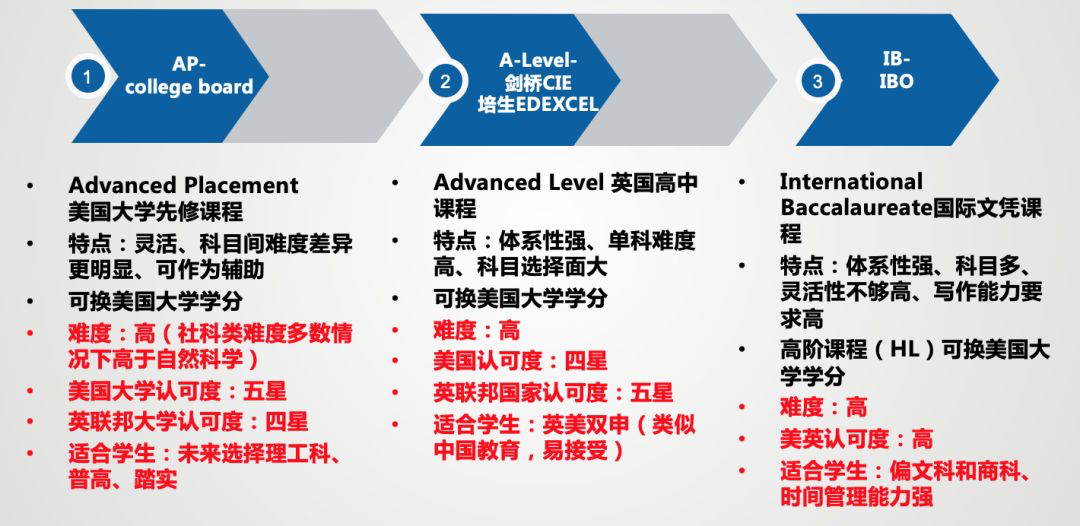 目前国内开设最多的课程体系是A-level, 即英国高中课程,因为他和中国的教育体制最相近,偏重学术;旗鼓相当的是美高课程+AP,相对适合理工科好的学生;IB学校数量第三多,是因为整体对学生的综合素质要求高,尤其对写作能力要求高,这个体系对孩子时间管理能力要求高,偏文科和商科强的孩子。