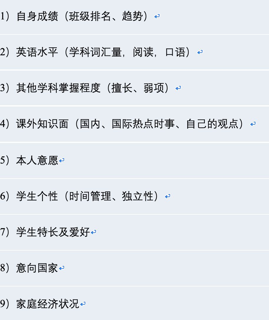 其实想要有明确的目标,就要多多了解自己,多问自己一些问题、多思考多总结、时时调整,因为随着自己的成长,原来明确的目标还有可能变化。我们给同学们列出了一些常见的了解自我的维度,其实这些维度也是各学校的 申请材料 和面试的问题题目。