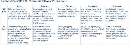 在今年的维立克面试中,维立克继续沿用去年的评分维度,即: Range , Accuracy , Fluency , Coherence , Interaction 五个维度,评分的权重更多集中在 Interaction 以及由此展现的学生的沟通能力,弱化对于语法和词汇的考察权重。