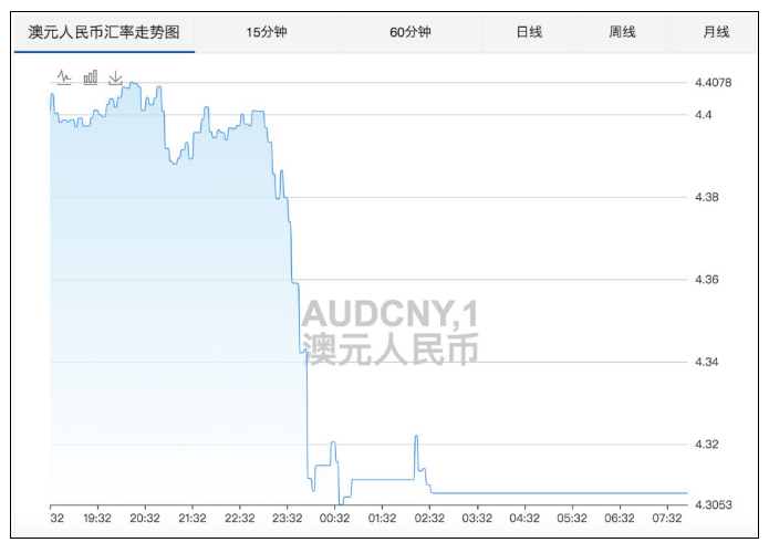 一觉醒来,澳币跟人民币的汇率,已经跌到1 CNY:4.3081 AUD,澳币已然踏入4.3时代!并且正朝着4.2大步走去!