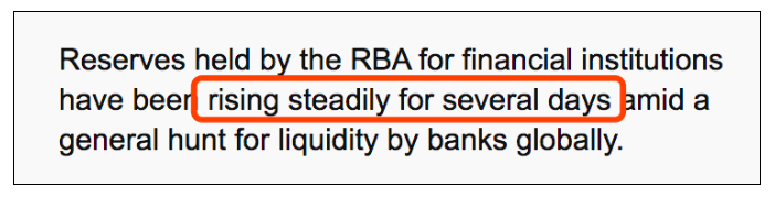 在全球银行普遍寻求流动性的情况下,澳大利亚储备银行为金融机构持有的准备金已连续几天稳定增长。