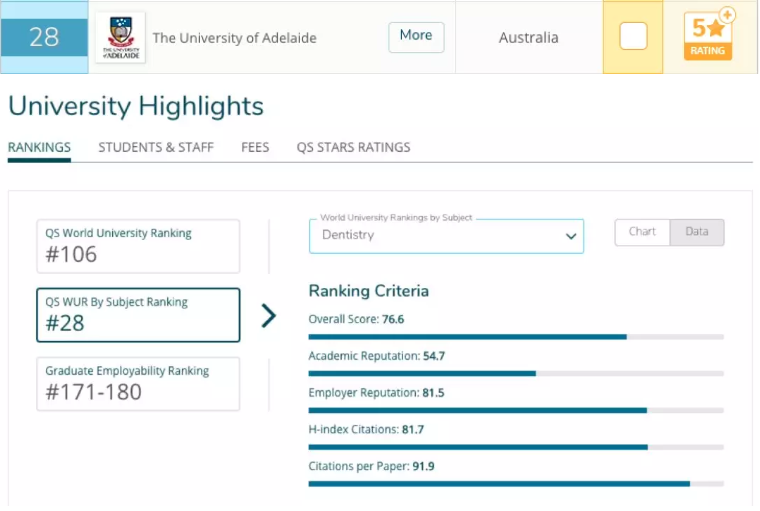 QS 学科排名评分项目中的雇主声誉获得了81.5分的好成绩,取得这项优异的成绩离不开大学、全体教职工和师生的共同努力。阿德莱德大学拥有澳大利亚先进的牙科模拟实验室,口腔健康和牙科学生通过在模拟实验室的训练获得丰富的经验。