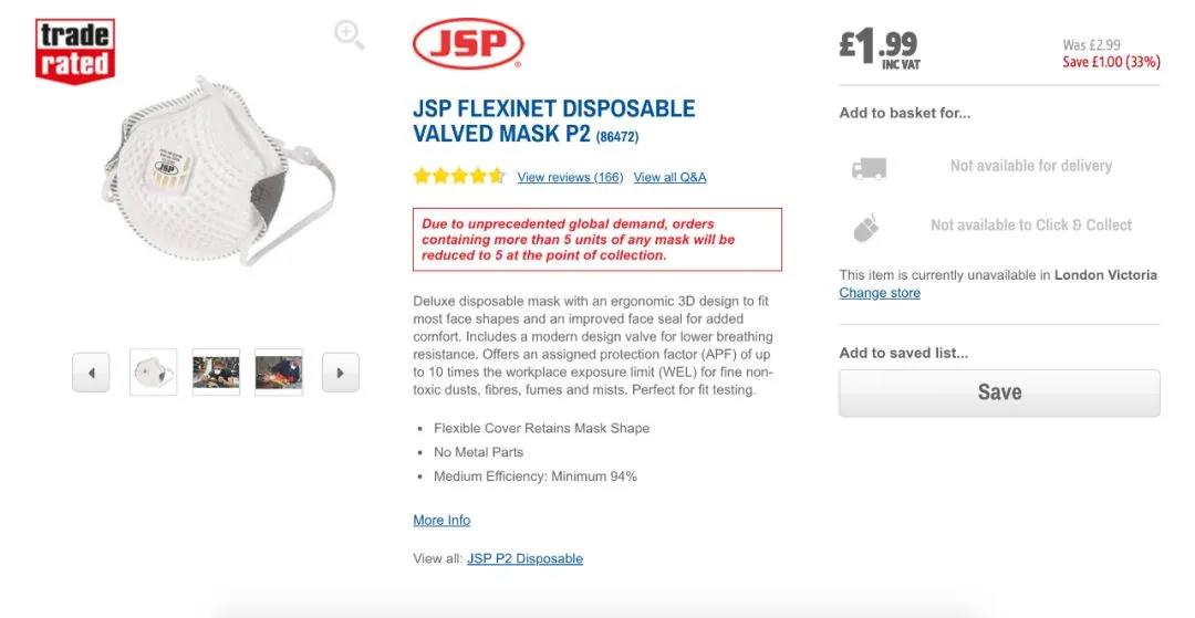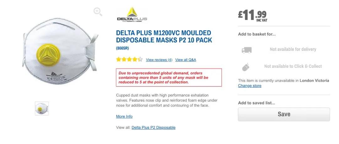 特别要注意的是:由于现在口罩在全世界范围基本上都是紧缺的情况,Screwfix也公布了口罩限购政策,一人只能买5个!