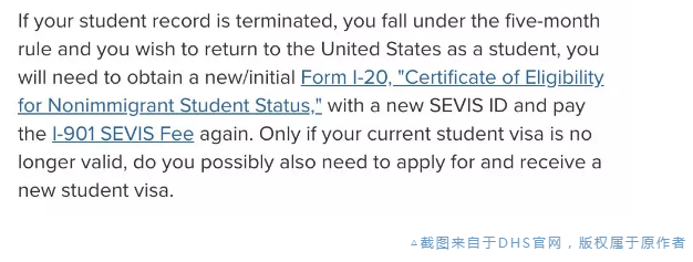 如果留学生满足以上两种情况中的任意一种,希望以F-1身份返回美国时,你就需要从学校那里获得新的I-20和新的SEVIS ID (需要再付一遍SEVIS Fee)。