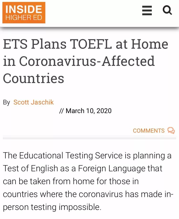 答:ETS这一举措并不是 ‘心血来潮’,而是结合疫情的发展,做出的决定: “在家考托福” 来配合学生完成自己的留学规划或者申请任务。 目前已经开展中国大陆以外国家的一些试推行点,国内考生还在等ETS和教育部考试中心协商后的进一步通知。