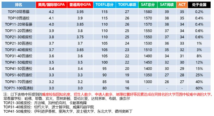 美国大学的招生原则向来以择优录取为原则,例如常春藤大学的招生对象是中国学生中最优秀的前4‰(千分之),top30大学的招生对象是最优秀的前1%,top50大学的招生对象是最优秀的前15%,top100大学是最优秀的60%。
