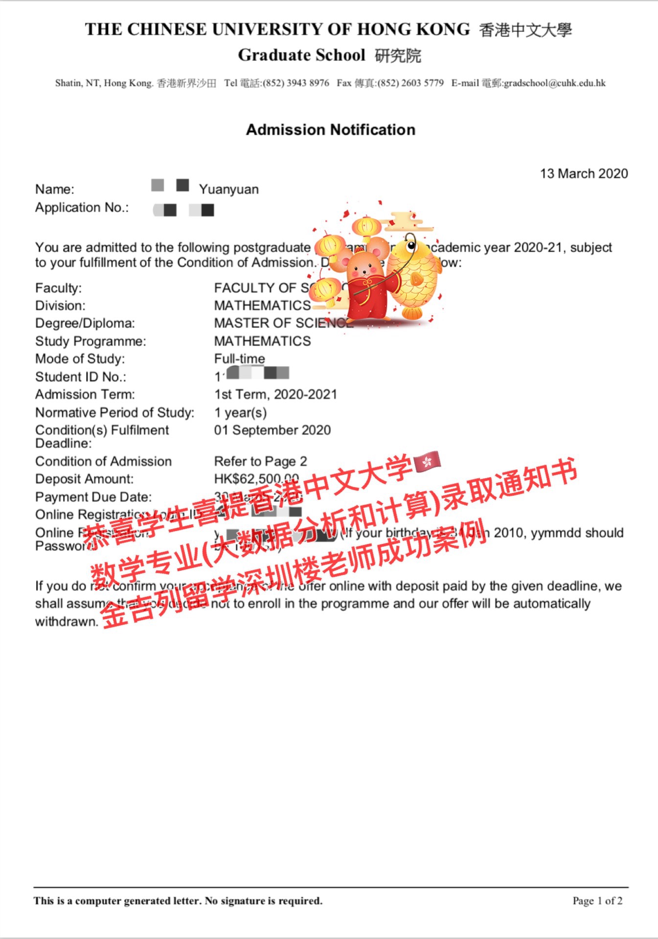 学生当时和朋友来咨询,对我印象感觉非常好,比较专业,后期有一直关注我的朋友圈,有了留学意识也努力早早的准备好了雅思考到了7分的好成绩,然后和妈妈一起二次咨询的时候,赶着在大三下学期开学前确定下来了,二次咨询马上签约了,我们搜集学生的资料给学生定校专业等学生也比较满意,并且我们建议学生好好刷分本科分数。在写文书的过程中,学生非常相信我们专业性按照文书老师的建议走,并且在文书上面进行认真的反馈和修改,我们积极给学生进行修改和润色。2封推荐信,从不同维度出发,选择推荐人,突出学生的学术能力和学校工作能力。并且做了2段相关的实习。顾问老师也提前向学生搜集好了学术资料,指导开具成绩单和均分证明,辅助资料,个人证件资料等,为学生及时预约申请。最终拿到了无面试香港香港中文大学 MASTER OF SCIENCE IN MATHEMATICS专业offer。