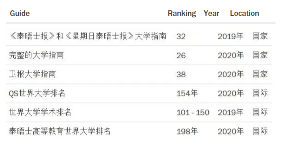 卡迪夫大学在其他权威 有影响力的世界机构的排行也位列前茅。像这样的排名每年都会重新审核更新一次,来帮助学生对不同的大学做出合适的选择。