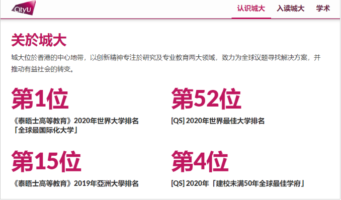 先来看下QS 2020年大学排名榜, 香港城市大学位居全球第52位、建校未满50年的全球50所最佳大学第4位。