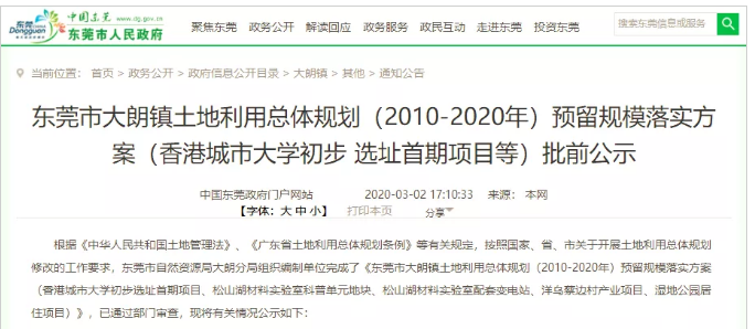 近日发现, 东莞市自然资源局大朗分局官网发布了《东莞市大朗镇土地利用总体规划(2010-2020年)预留规模落实方案( 香港城市大学初步选址首期项目 等)批前公示》。也就是说