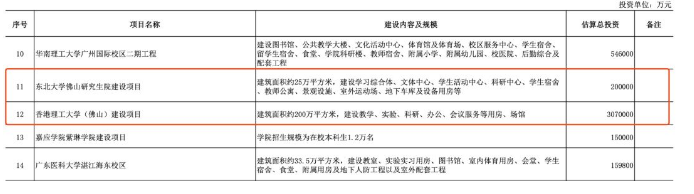 在《广东省2020年重点建设前期预备项目计划表》中,佛山高校建设也有进展披露。除了东北大学佛山研究生院建设项目之外,香港理工大学(佛山)建设项目也赫然在列,列入省2020年重点建设前期预备项目计划,估算投资307亿元,建筑面积约200万平方米,建设教学、实验、科研、办公、会议服务等用房、场馆。