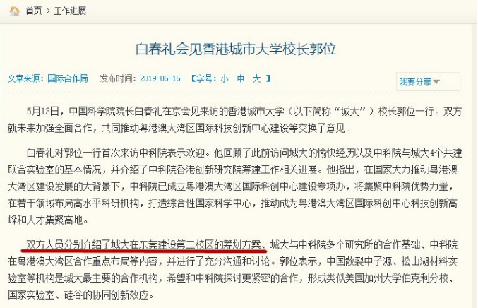 关于到东莞建校,其实早在去年就有消息说,香港城市大学要来东莞建设第二校区了。在当时中科院一篇稿件提及,中国科学院院长白春礼会见了香港城市大学校长郭位是,“双方人员分别介绍了 香港城市大学在东莞建设第二校区 的筹划方案……”