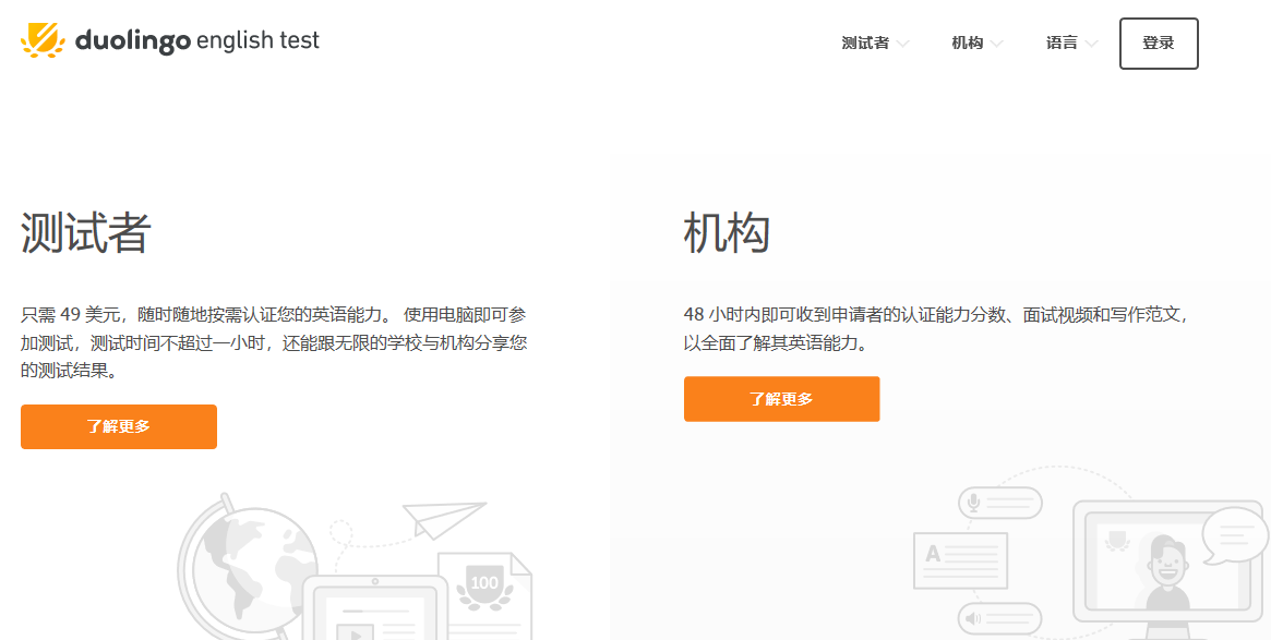 Duolingo English Test 是一项面向当今国际学生和机构的现代英语水平评估测试。测试可根据需要在线提供。您可以通过电脑和网络摄像头在家进行测试,而无需预约或前往考试中心参加测试,测试使用计算机自适应技术,让问题难度将就考生的水平。测试还包括视频面试和写作样本,当您将结果与分数发送至机构时,这些样本将同时发送至相关机构。