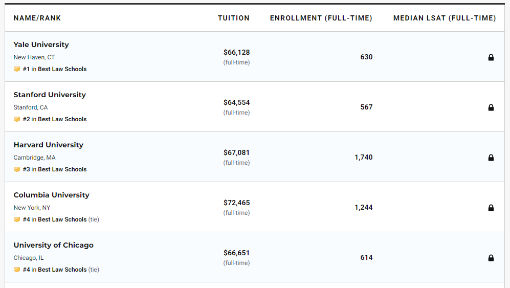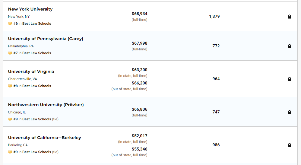 今年最佳法学院排名TOP与去年略有差别,但TOP5院校仍然是以下几所: