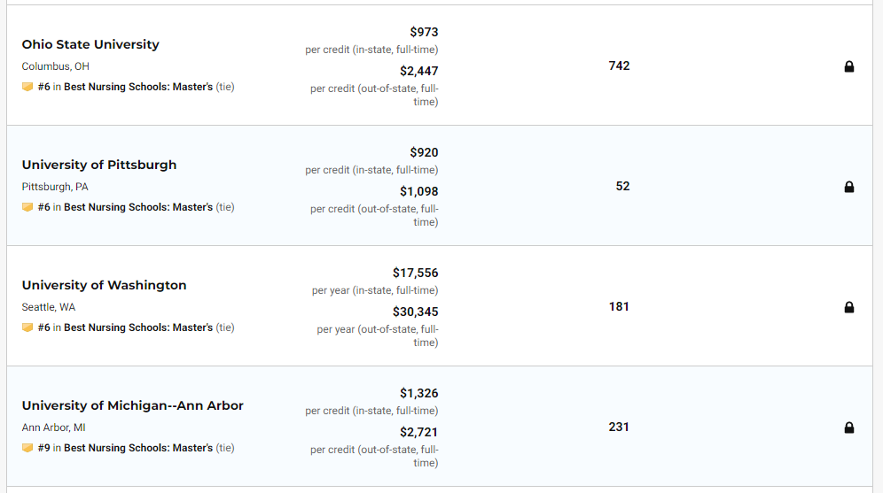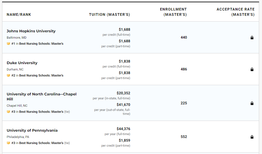 2020最佳护理学院的前两名,仍旧是约翰霍普金斯大学和杜克大学,北卡教堂山分校与宾大排名并列第三。除此之外还有麻醉护理学、家庭医护等方向,因国际生申请的不多,就不一一列出。