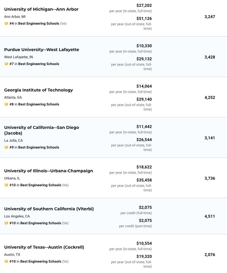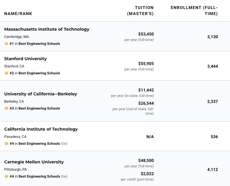 今年排名前三的工程学院与去年保持一致,依次是MIT, 斯坦福和UC Berkeley。