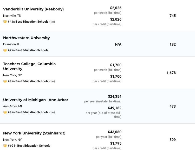 范德堡大学皮博迪教育学院的排名继续上升,由去年第6名升至第4名。