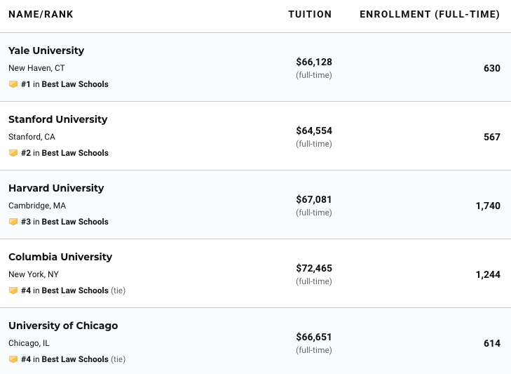 耶鲁继续登顶最佳法学院,斯坦福和哈佛的法学院紧随其后分列二、三位。