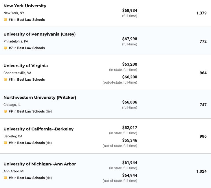 哥伦比亚大学法学院今年上升1名,与芝加哥大学法学院并列第四。