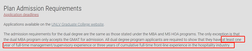 例如:内华达大学拉斯维加斯分校的申请要求,一年全职管理工作经验,或者3年前台工作经验。