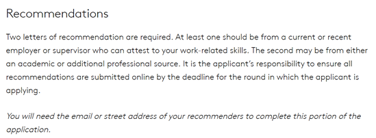 学校虽然没有明确规定多少年酒管从事经验,但是他要求其中一封推荐信必须是从你最近工作中的老板或者管理人员,能够证明你工作能力的人写的。间接提出了工作经验要求。