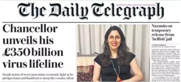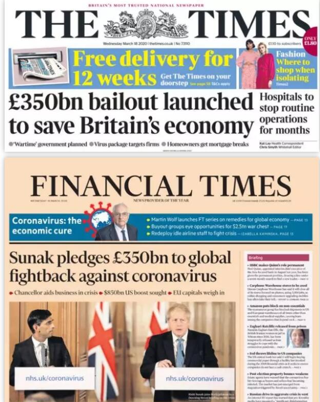 包括《泰晤士报》、《金融时报》、《每日电讯报》在内的多家英国报纸,今天的头版头条聚焦 英国政府因疫情投入3500亿英镑的经济扶持计划。