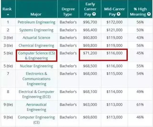 在2017年PayScale美国大学专业毕业薪资排名上,我们可以看到: