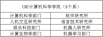 CMU是全美乃至全世界最大的计算机学院。对于一般的美国院校来说,计算机科学只是设置为一个系,即Department of Computer Science。 然而,CMU对CS的建设非常有诚意,直接开设了一个院,有8个系: