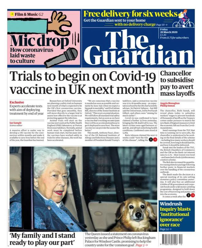今天《卫报》的头版头条报道了英国新冠疫苗的研发情况。